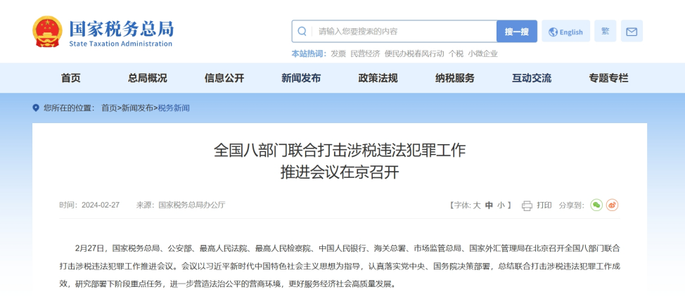 2024年2月27日,税务总局、公安部、更高人民法院、更高人民检察院、中国人民银行、海关总署、市场监管总局、外汇管理局在京召开全国八部门联合打击涉税违法犯罪工作推进会议,总结2023年联合打击涉税违法...